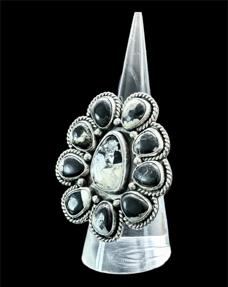 Categories: All Earrings Cuffs Pendants Rings Stones and Accents White Buffalo Cluster Ring $190.00 Moonwater Ring $90.00 Gambler’s Curse $120.00 Nightcrawler $90.00 Golden Hour Ring $110.00 Stillwater Ring $95.00 Storm Rider Ring $85.00 Trailblazer Ring $90.00 Wild Horses Ring $100.00 Cactus Blossom Ring $110.00 Sage and Sky Ring $100.00 Midnight Buffalo $125.00